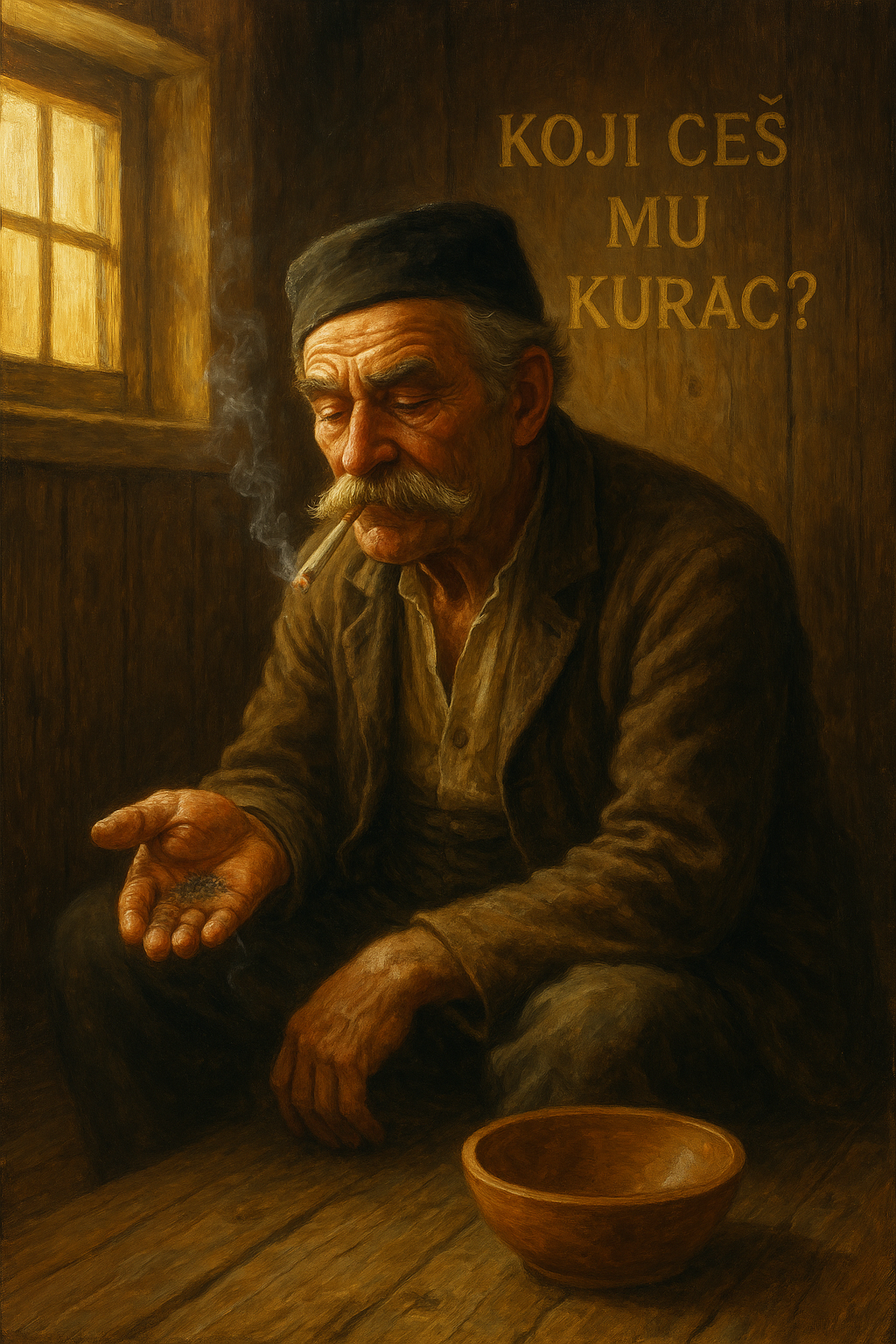 U jednoj planinskoj kući, pod sveže postavljenim patosom, starina sa brkovima sedi kao da sedi vekovima. U ruci cigara. U očima večnost. Baba mu postavila pepeljaru – čin ljubavi i domaćinstva. Ali on zna da je sloboda pre svega.