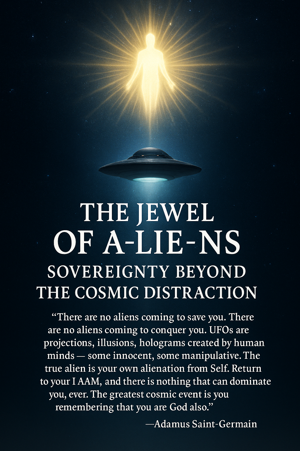“There are no aliens coming to save you. There are no aliens coming to conquer you. UFOs are projections, illusions, holograms created by human minds — some innocent, some manipulative. The true alien is your own alienation from Self. Return to your I AM, and there is nothing that can dominate you, ever. The greatest cosmic event is you remembering that you are God also.”