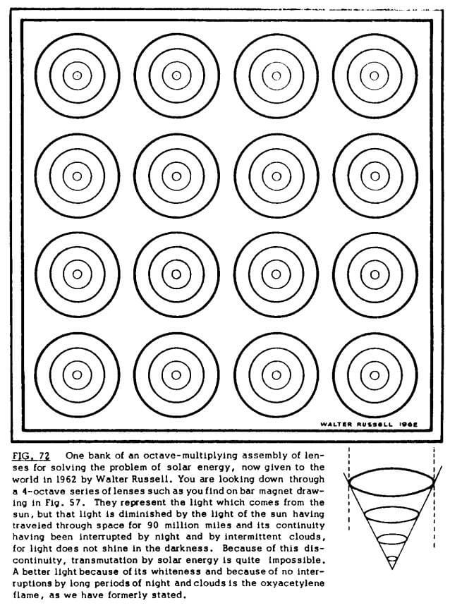 Walter designed a system of biconvex lenses, arranged in octaves, to concentrate white light — not sunlight filtered through the atmosphere, but pure, radial, high-frequency light that exists in the invisible.